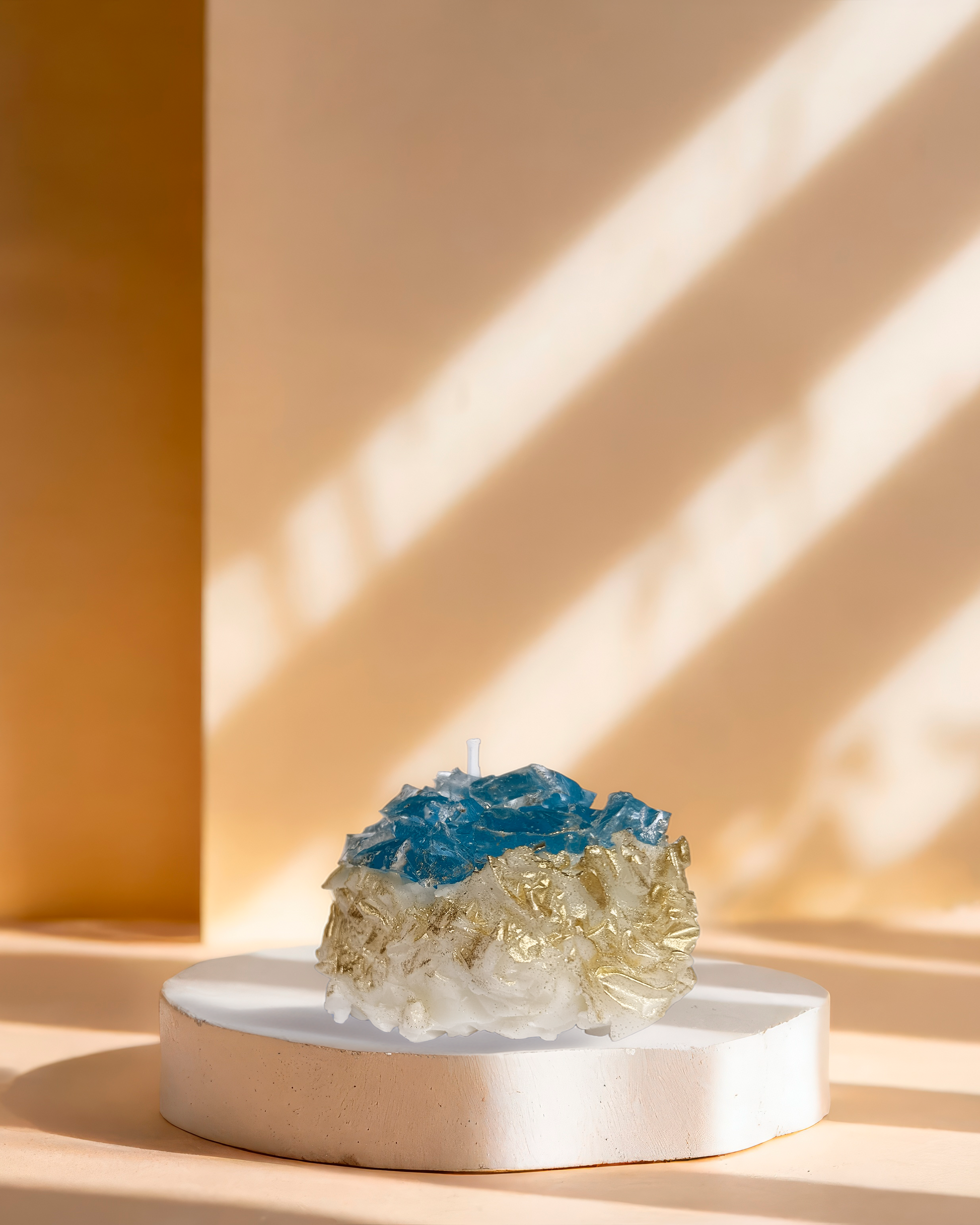 A Vela Crystal Lazuli carrega a essência da clareza e da renovação. Inspirada na pedra Lápis-Lazúli, símbolo de sabedoria e serenidade, ela combina tons azuis intensos com detalhes dourados, refletindo luz, calma e equilíbrio.